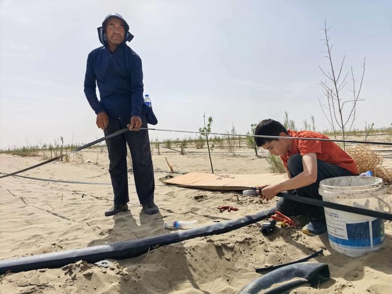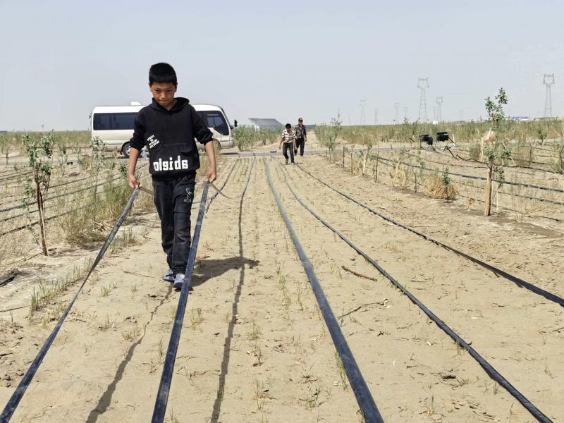 14岁的努尔麦麦提正和两个年龄相近的兄弟利用周末时间帮着姐姐、姐夫布置水管,他们小手沾满了泥沙,“我们讨厌沙子,想让这里变成绿色。”
