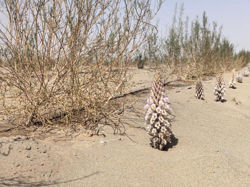 目前,一些植被的脚下已经有成串的肉苁蓉冒出形似宝塔的花蕾。