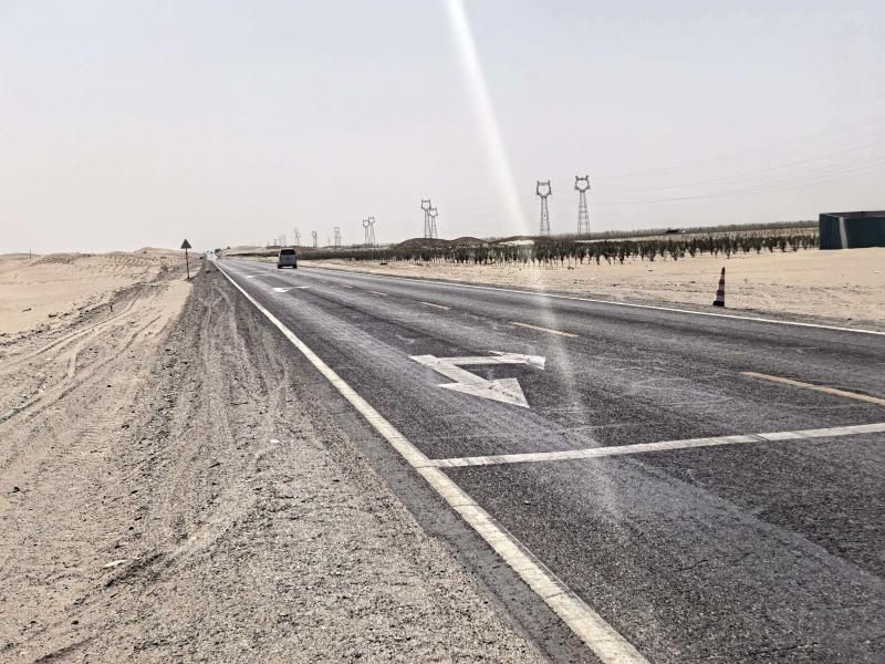 驱车离开城镇,一条蜿蜒公路直通沙漠,望不到尽头。远望公路两侧却是两番不同景象,东侧,是一个个高低不平的沙丘,高一些的足有十余米,大风吹过,黄沙霭霭;而公路西边则是一片平整的绿色,与对面形成鲜明对比,矮树虽然不高,但覆盖面极广,足有万亩。