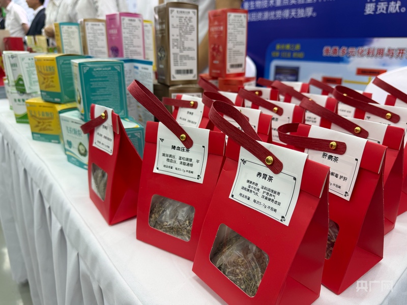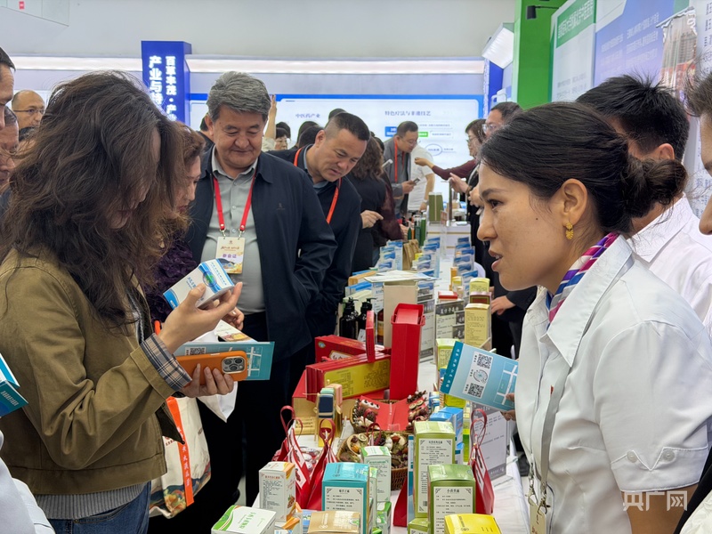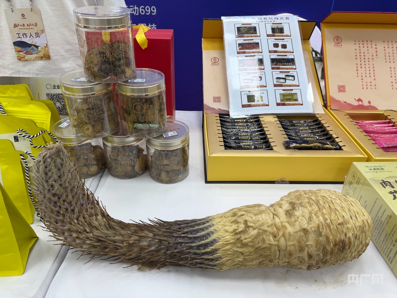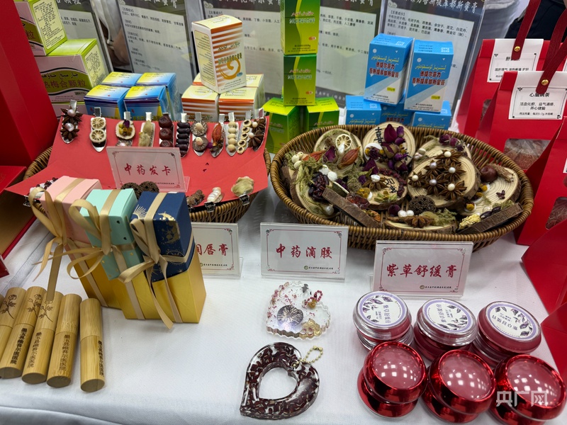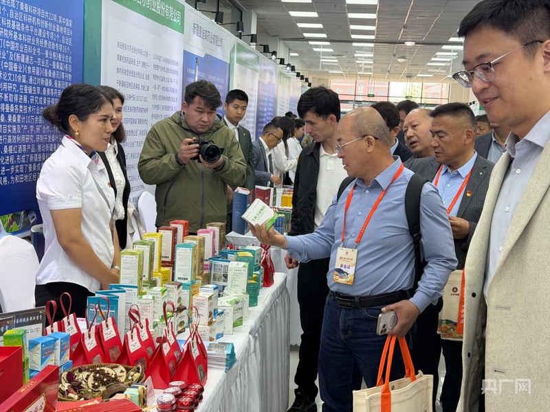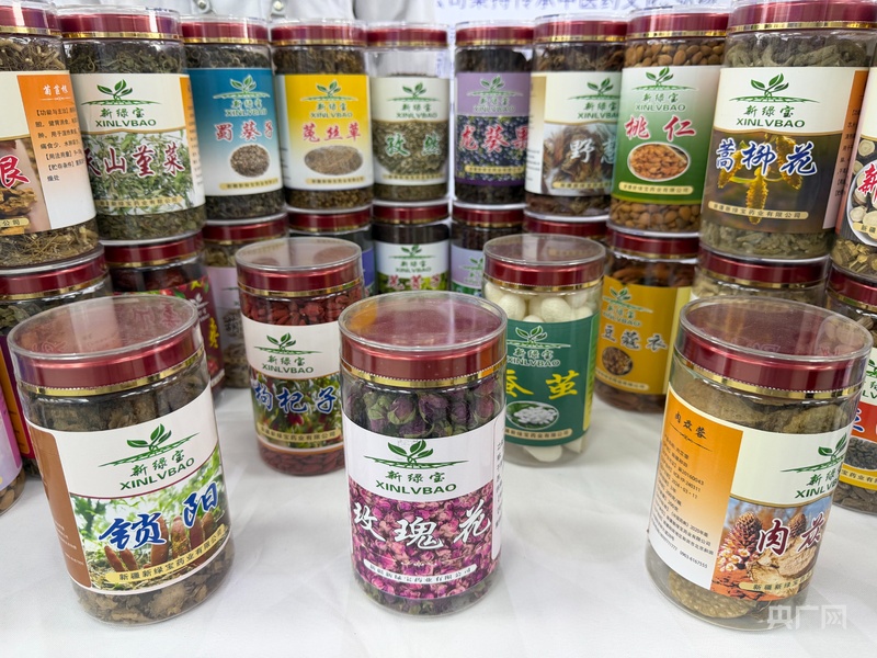 会议现场,和田地区中药生产企业带来的中药产品 (央广网记者 丁安 摄)
