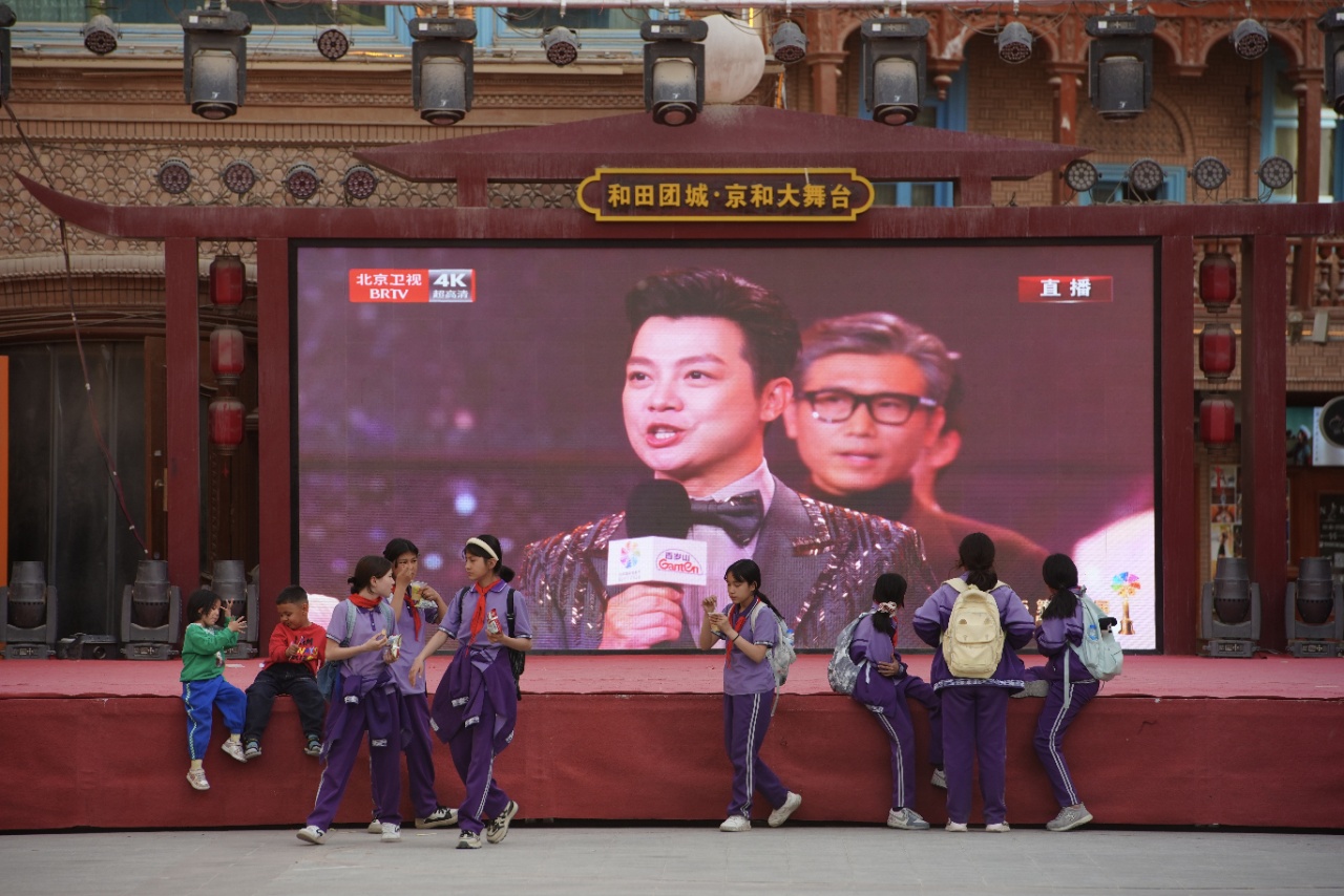 2026年4月16日晚上7点半,在和田团城,“京和大舞台”大屏幕正在直播第十六届北京国际电影节开幕式。