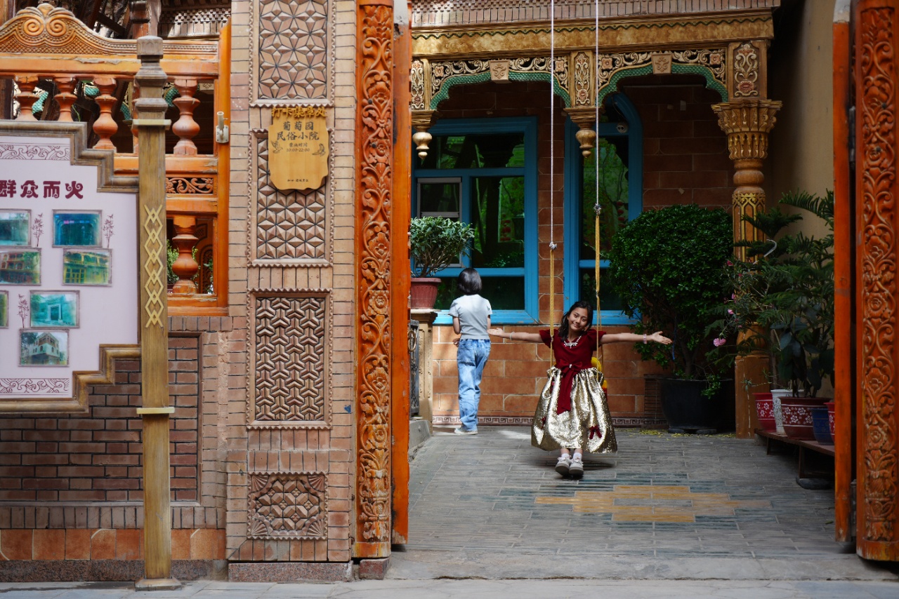 在北京援疆图片展览旁边的小院里,孩子正在荡秋千。