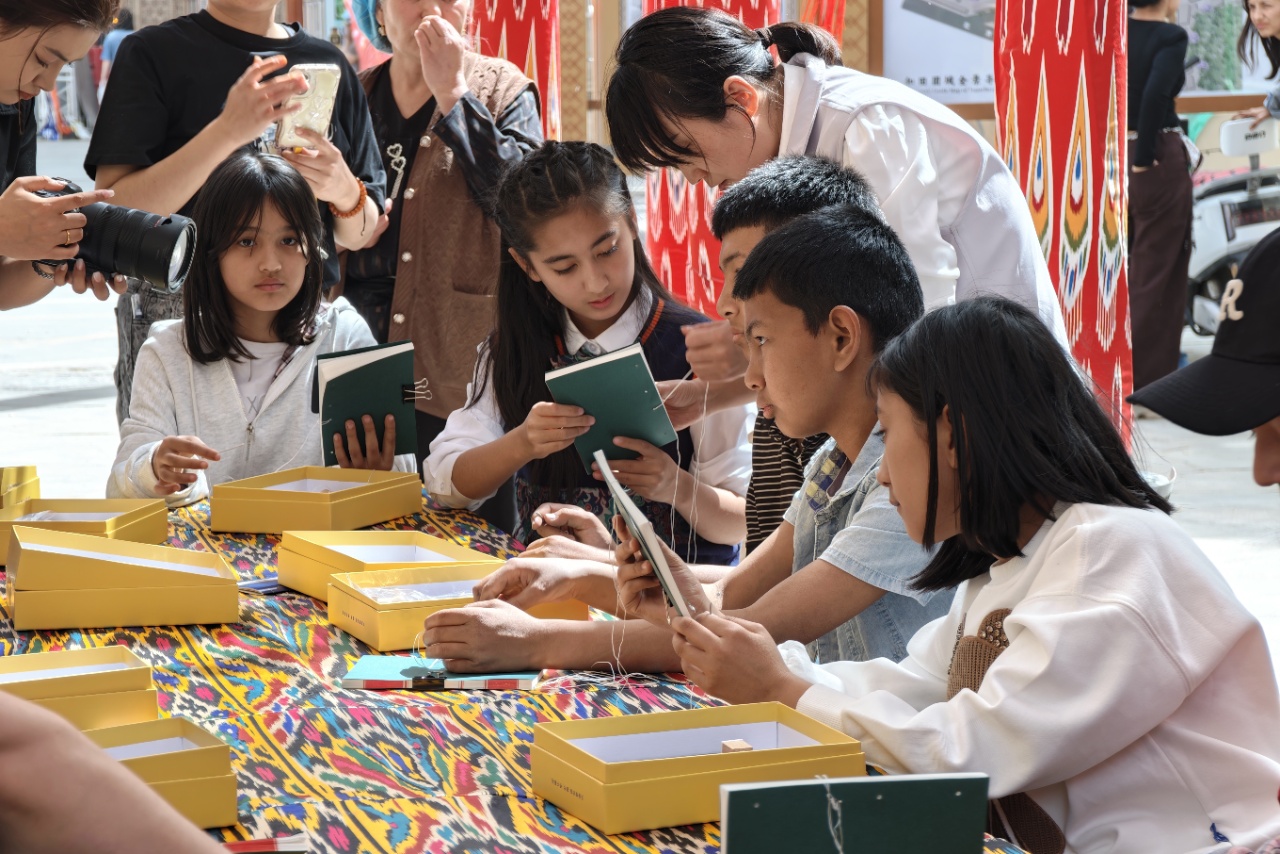 4月12日,“京和书吧”启用,这是北京在和田援建的首个书吧项目。图为学生们学习制作线装书。