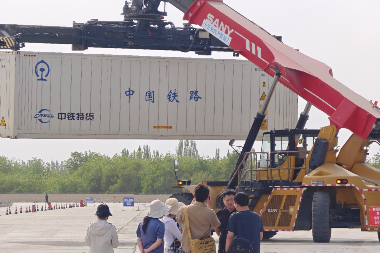 在新疆和田市火车站,正在进行集装箱搬运。目前,京疆亚货运班列实现双向对开。