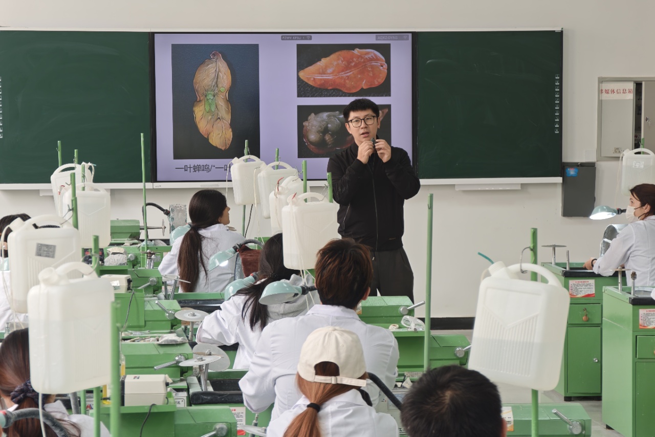 4月13日,在昆玉职业学院,北京援疆教师沈罕正在为珠宝玉石专业的学生讲课。2023年,在北京援疆的帮扶下,昆玉职业学院建立了和田地区第一个宝玉石鉴定与加工高职专业,今年首批学生即将毕业。