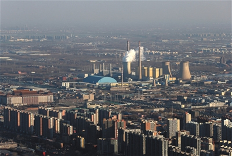 2016年12月,从国贸高楼俯瞰,供暖期的华能北京热电厂正在运转。