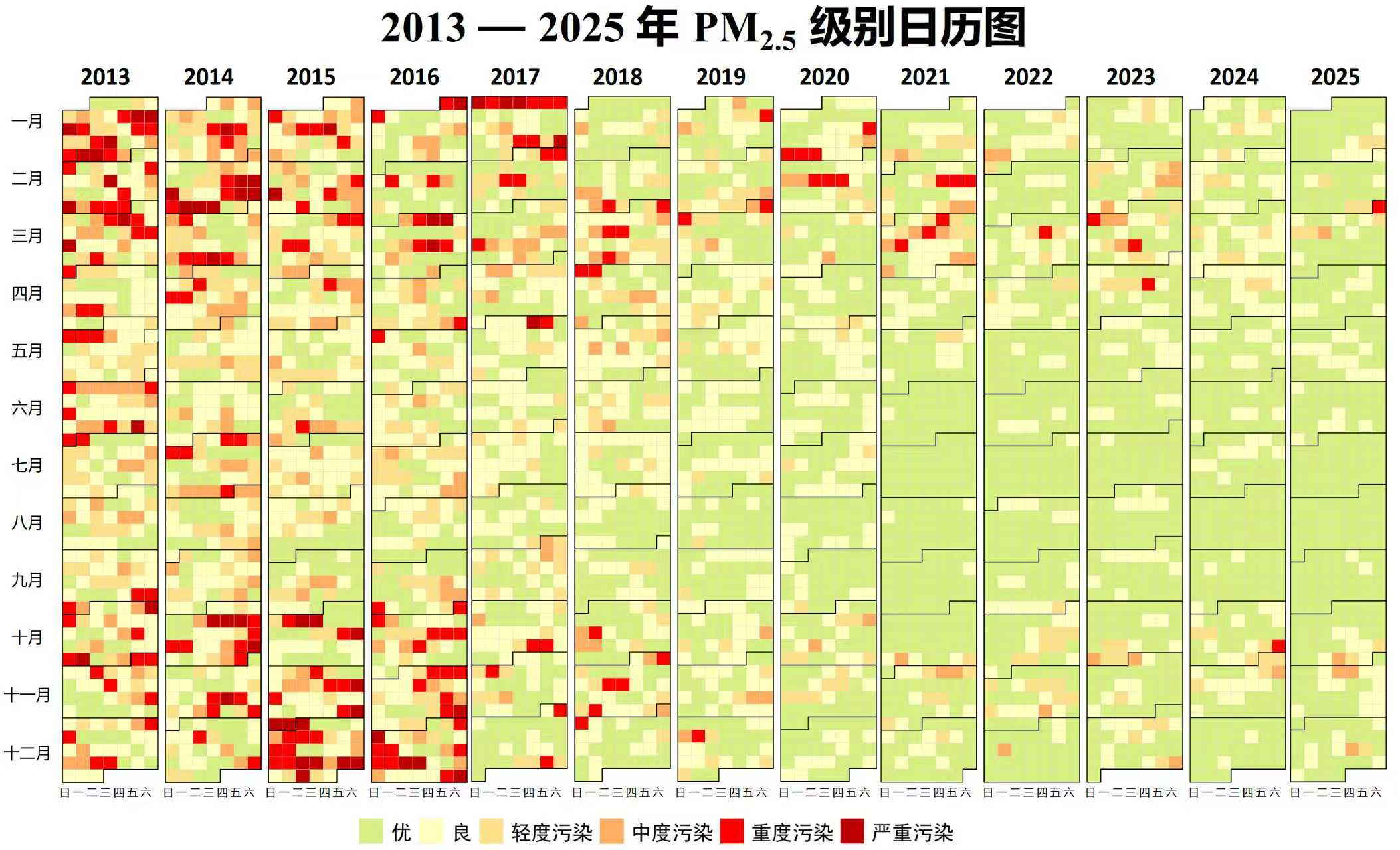 2013-2025年北京市PM2.5日历图/市生态环境局提供