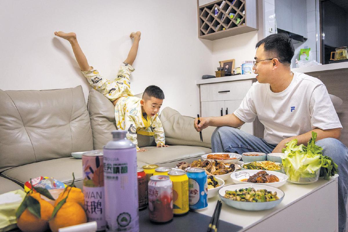 3月19日晚,张家口,妻子早已在家中备好饭菜,李橙子边吃边和孩子说笑。