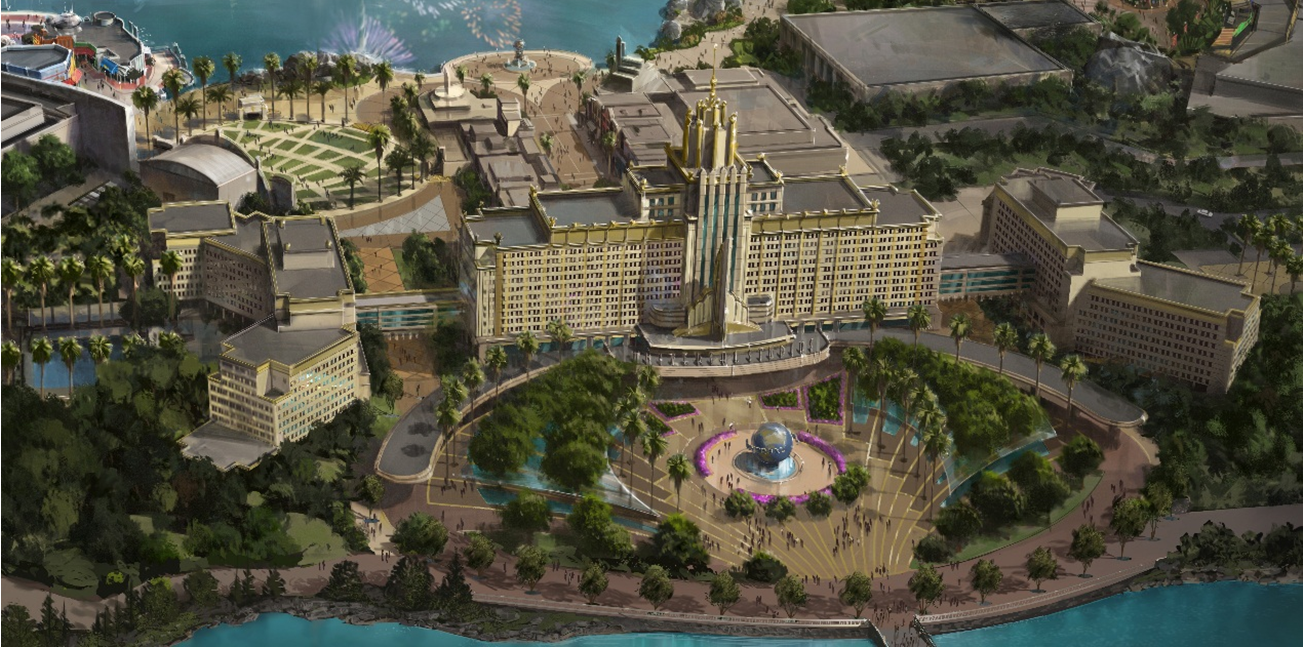 环球影城大酒店建筑面积约9万平方米,采用西班牙复兴时期的建筑风格,内部配有大量电影元素装饰,可提供800间客房,定位四星级家庭度假酒店。酒店一层为环球影城主题公园主入口,游客将穿过环球影城大酒店进入主题公园。